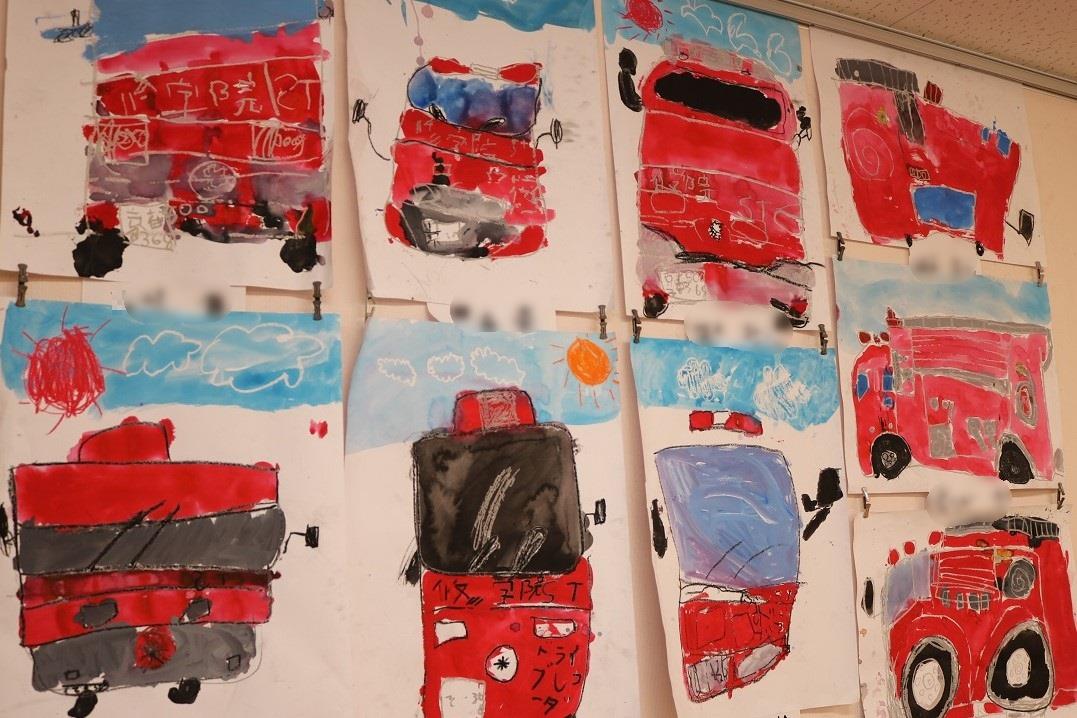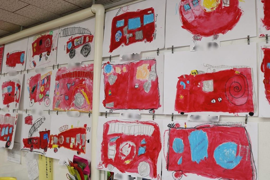 この間の避難訓練で幼稚園に来てくれた消防車を見て描いた絵です