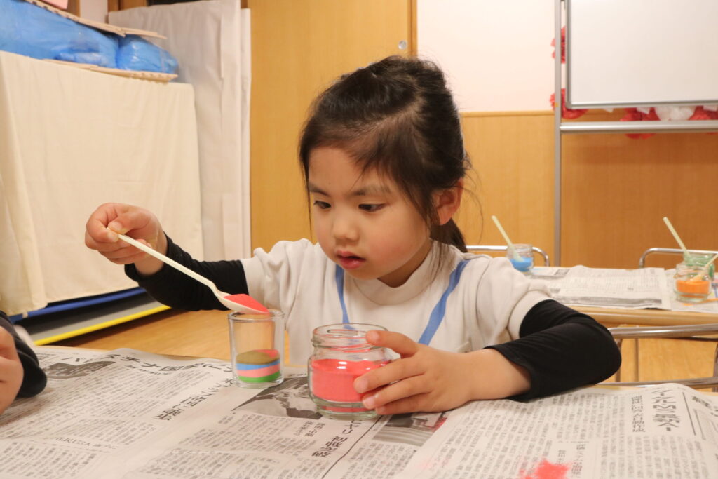 色とりどりの砂をそーっと入れて