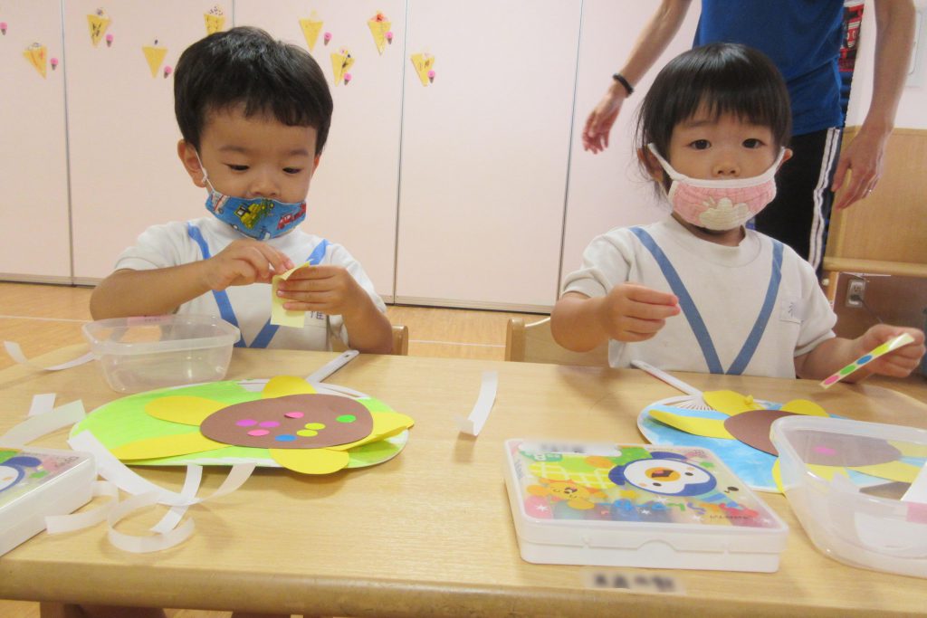 2歳児クラスはうちわの制作やスイカ割り、肝試しをクラス毎に楽しみました