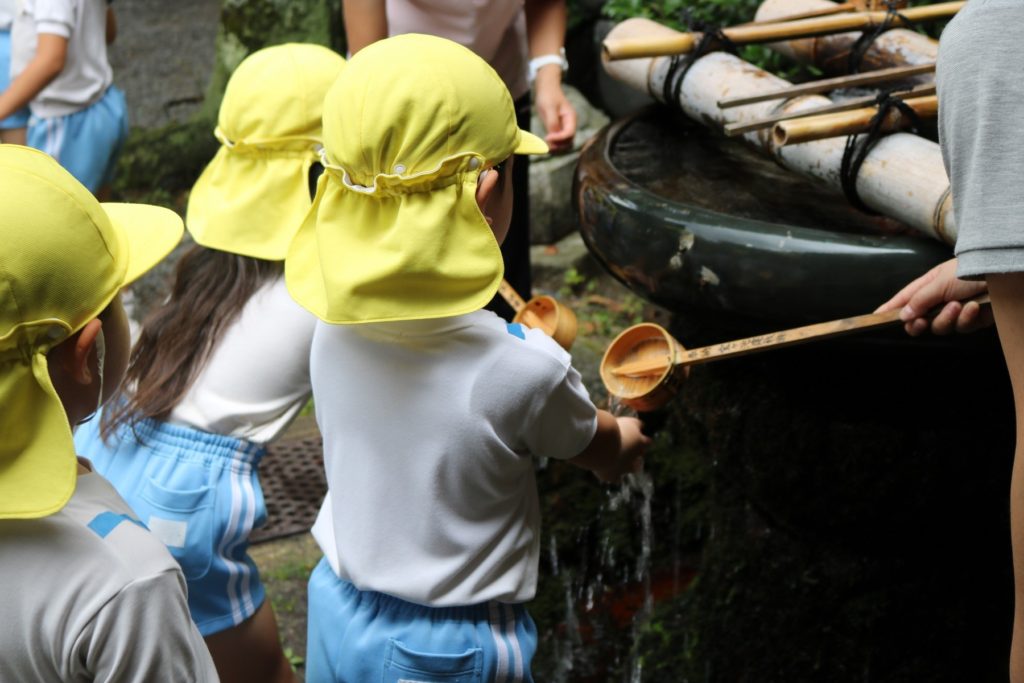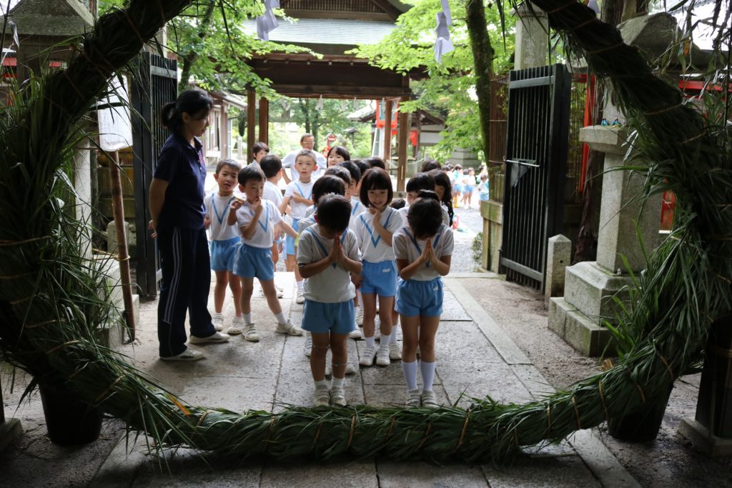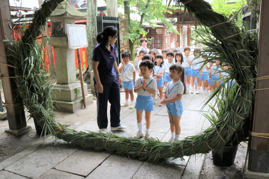 今日は、園の隣にある三宅八幡宮に毎年恒例の「茅の輪くぐり」にでかけました