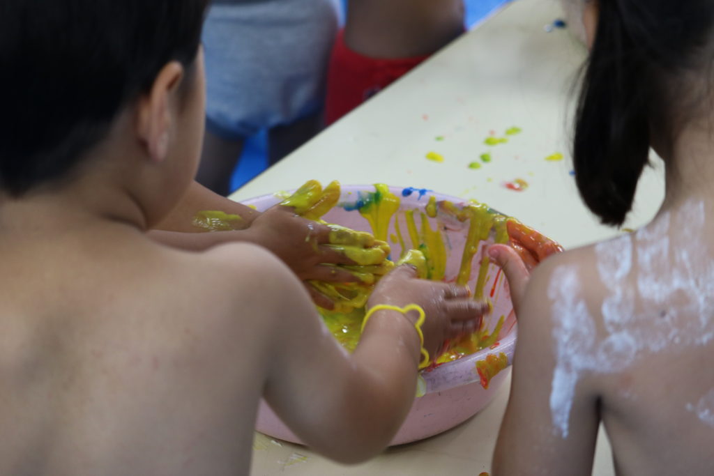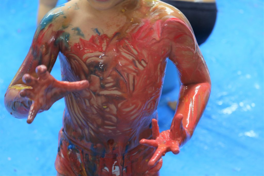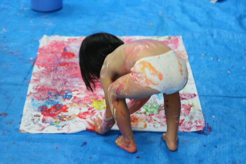 まずは、絵の具の感触を確かめて、恐るおそる手のひらでペタペタ、慣れてくるとお腹にベタベタ、面白さがわかると全身にべったべた!