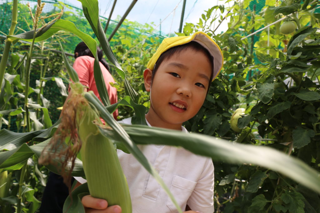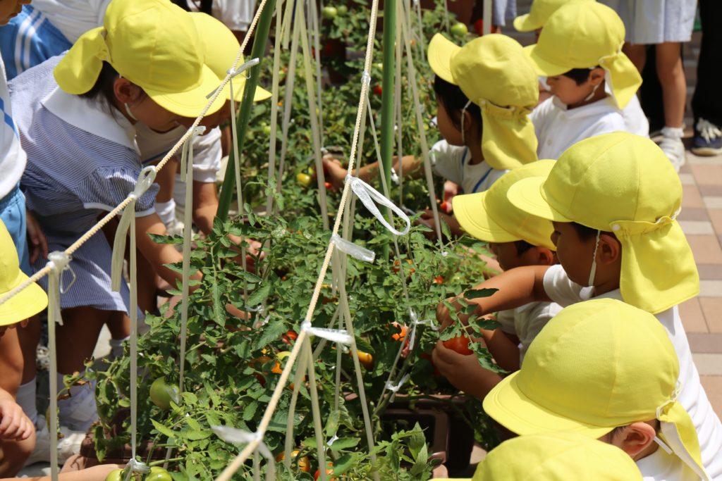 年長組は、園の畑に実った夏野菜たちを収穫しました!