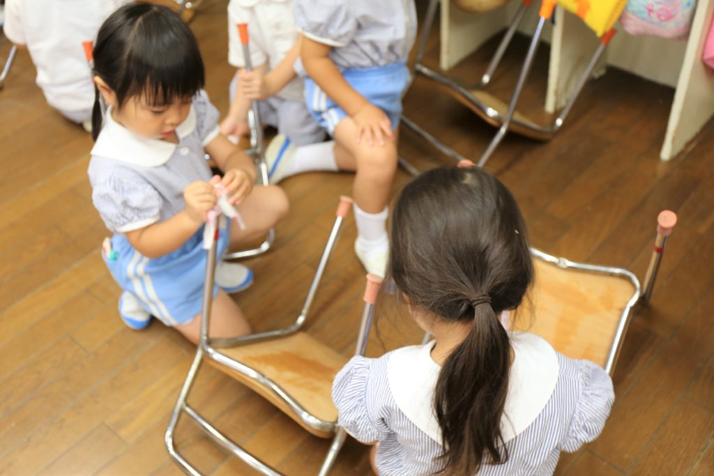 さくら組のみんなが、一生懸命自分の椅子を磨いてお掃除をしていました