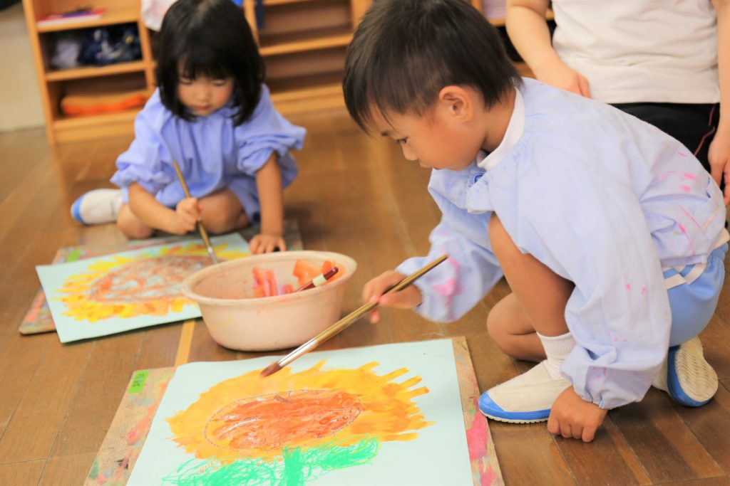 ところが、さくら組の教室をのぞいたら…、子どもたちが描いたひまわりが画用紙いっぱいに咲いていました
