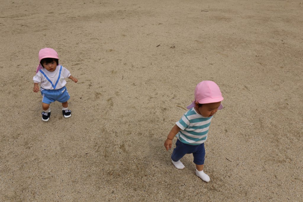 園庭に立つと最初は地面の感触を確かめながら一歩一歩慎重に歩いていたのに、
