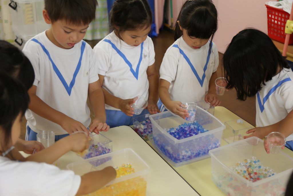 子どもたちは、嬉しそうにアクアジェルの色を選び、マイフラワーポットを作ります