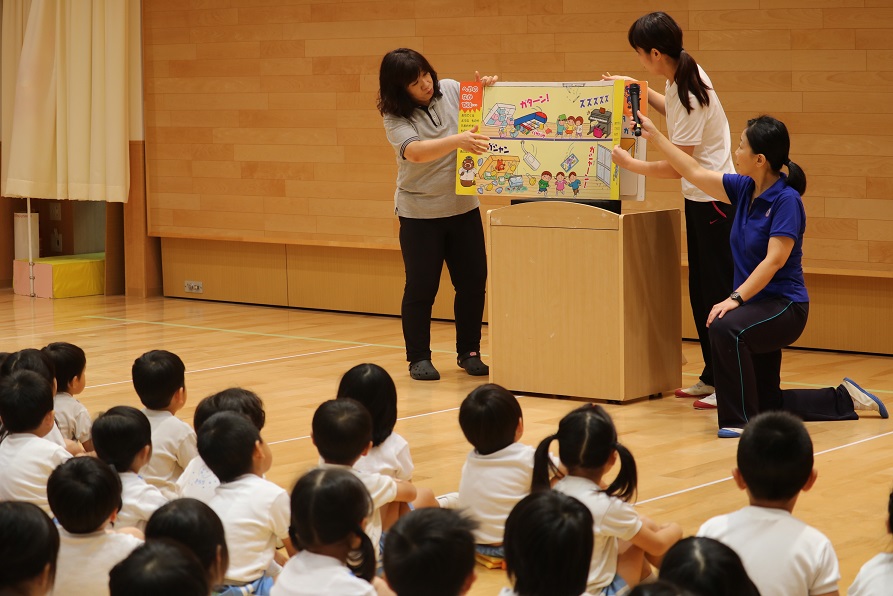 訓練のあと、地震があった時の避難方法の大型絵本をみんなで読みました