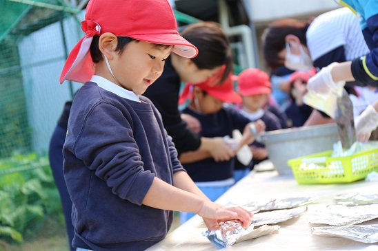 さあ、まずは自分でお芋を包みます