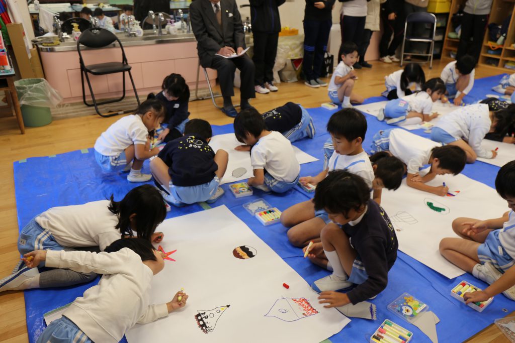 今回は、研究保育のため他のクラスの先生たちに見守られながらの制作でした