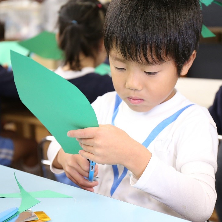 キラキラの色紙を細かく「チョキチョキ」