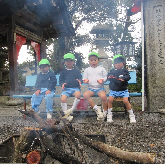 寒い帰り道、三宅八幡神社の焚火で暖をとる子どもたち☺