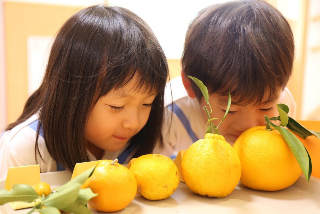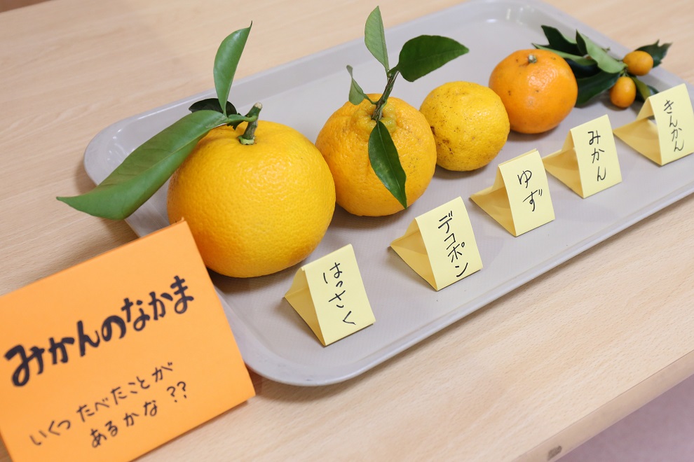 こじか組の山本先生が家の庭から採ってきた果物で「みかんの仲間」のお話をしてくれました