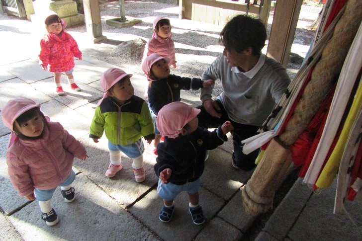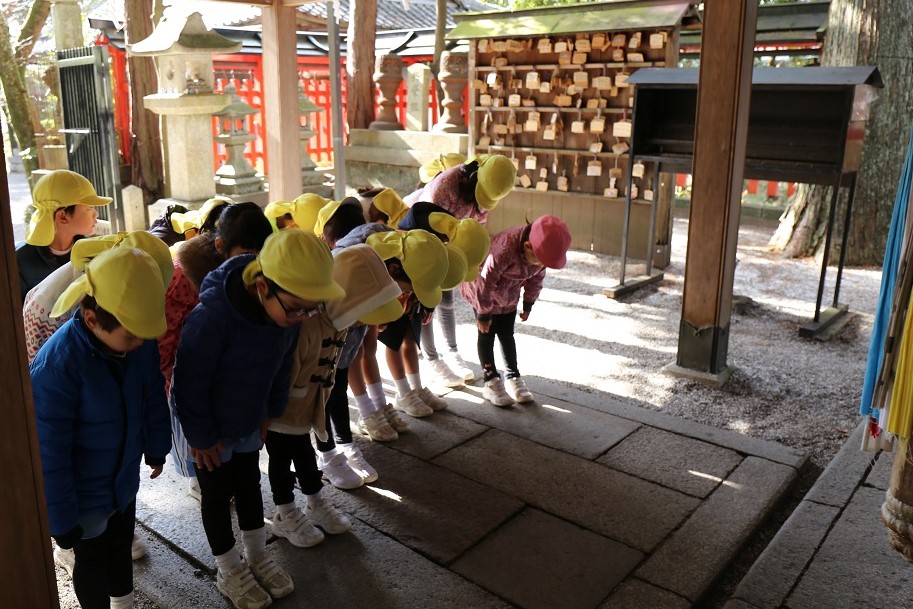 さて、今日は2号認定・3号認定の園児たちが三宅八幡神社へお参りに行きました。