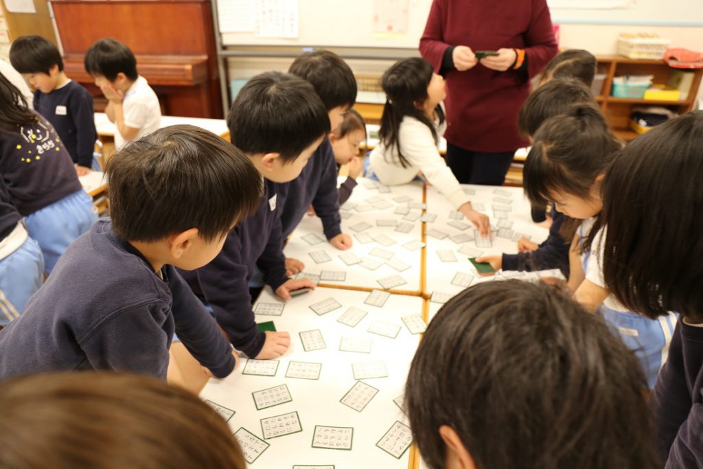 どの子も机いっぱいに並んだ札とにらめっこ