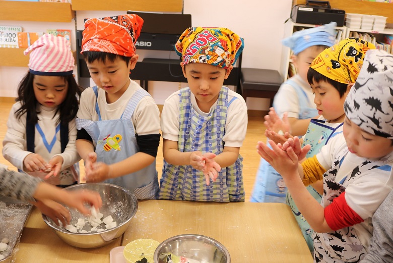 自分が丸めた団子を、みんなと同じ大きさになるよう見比べながら丸めます