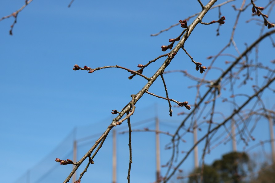 ランチルーム外の枝垂れ桜のつぼみも紅くふくらんできました