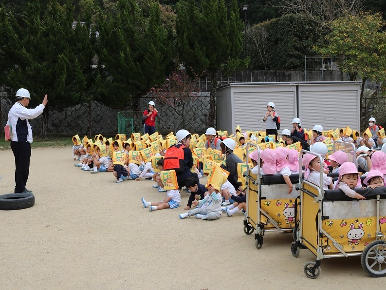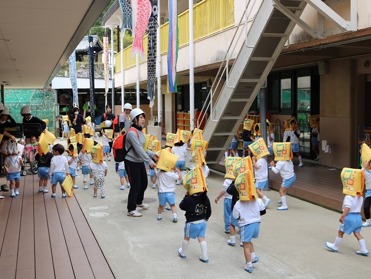 園児たちは防災頭巾をかぶり先生の指示に従い逃げます