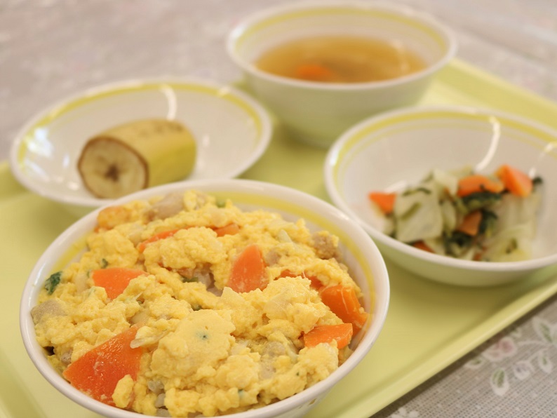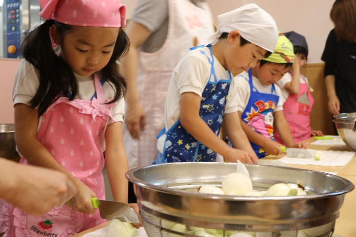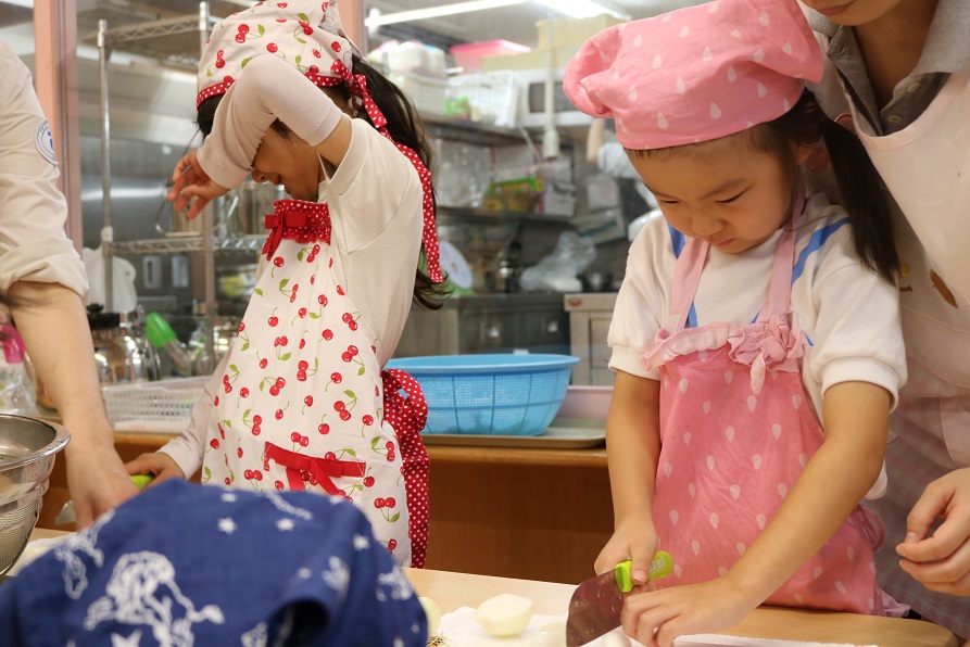 年長さんのクッキングにも遭遇、一生懸命玉ねぎの皮をむく年長さん、可愛かったですね