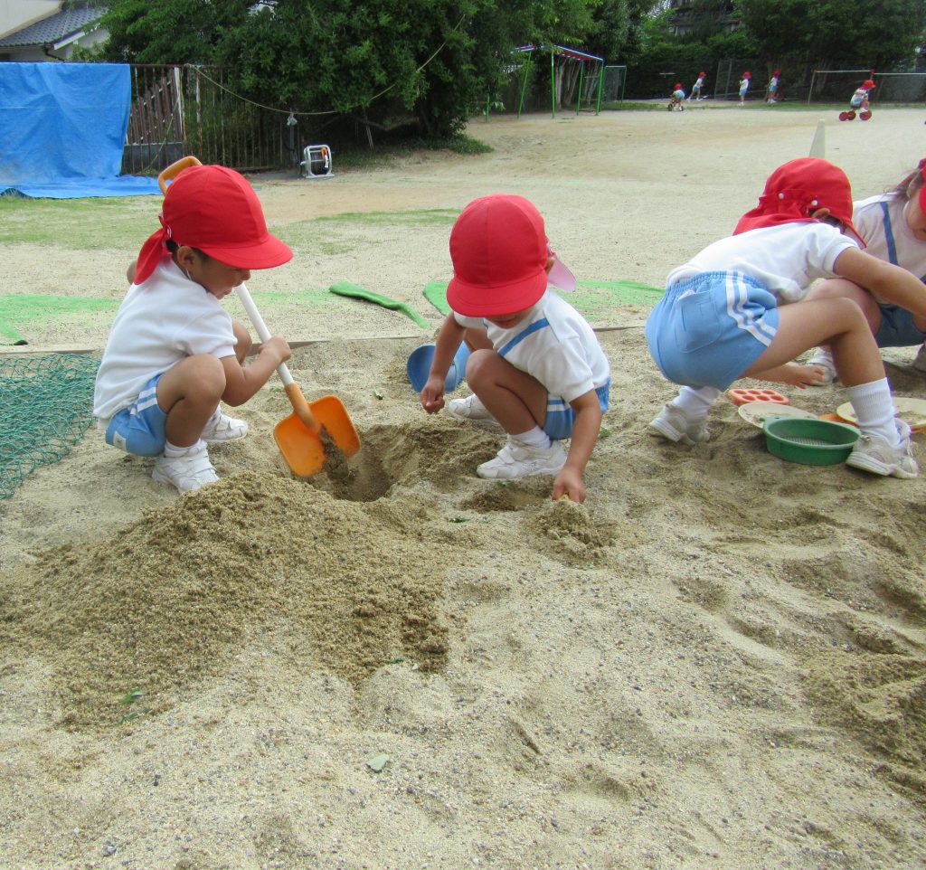砂場で一生懸命穴掘りをしている男の子