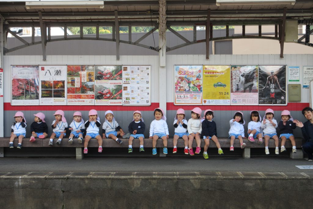 みんなで並んで座って電車を待ちます