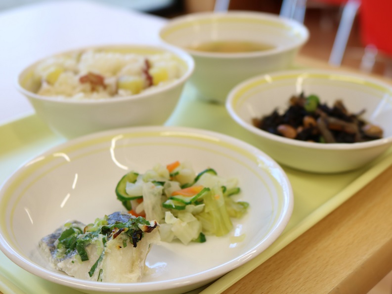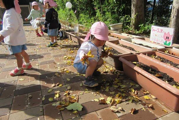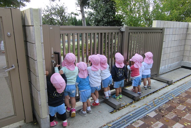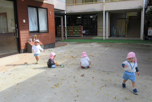正門の方に落ち葉を見に来たこじか組(1歳児)のお友だち