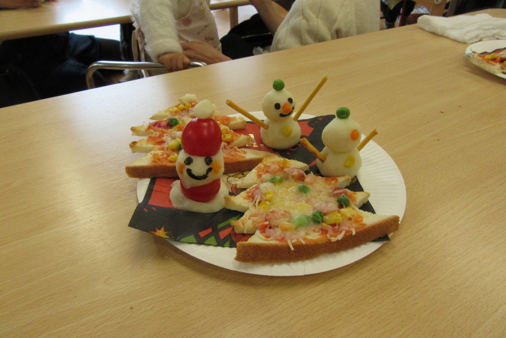 色んな形のピザにマッシュポテトで作った雪だるまとサンタさん⛄