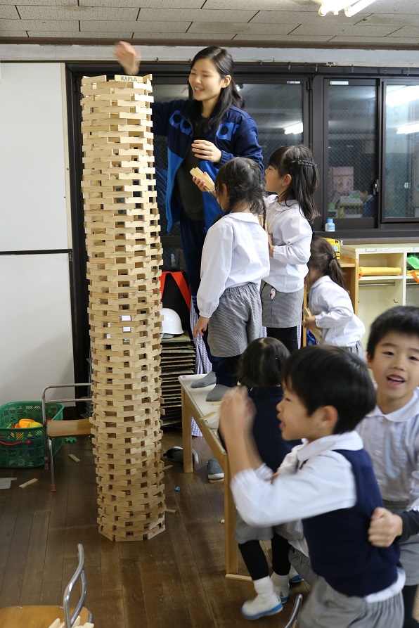 そして、お迎えを待っている間、先生と女の子たちは一生懸命『カプラ』を積んでいました
