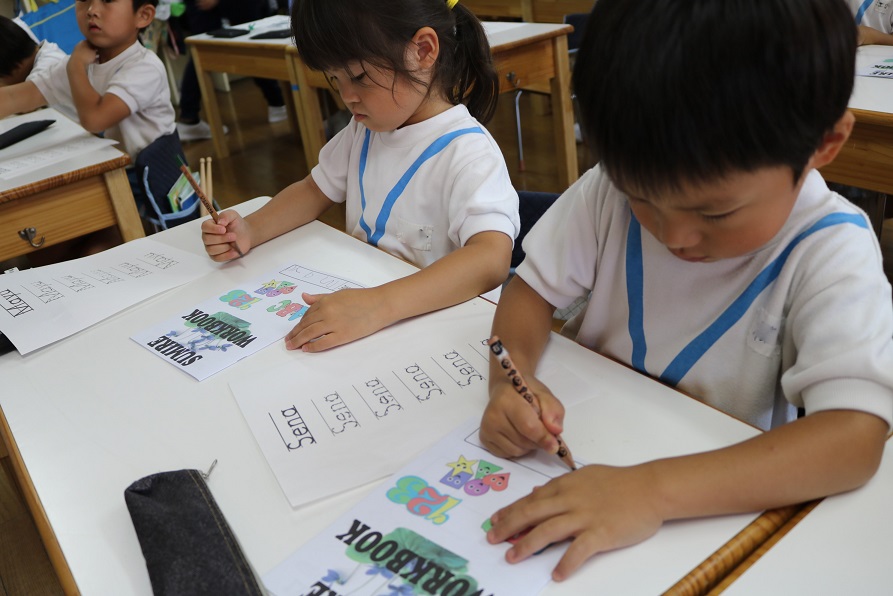 ワークブックの表紙の真っ白な枠のなかに名前を書きます