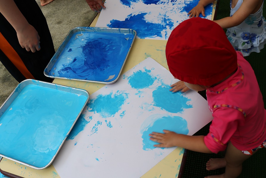 両手にいっぱい絵具をつけて画用紙にペタペタ✋