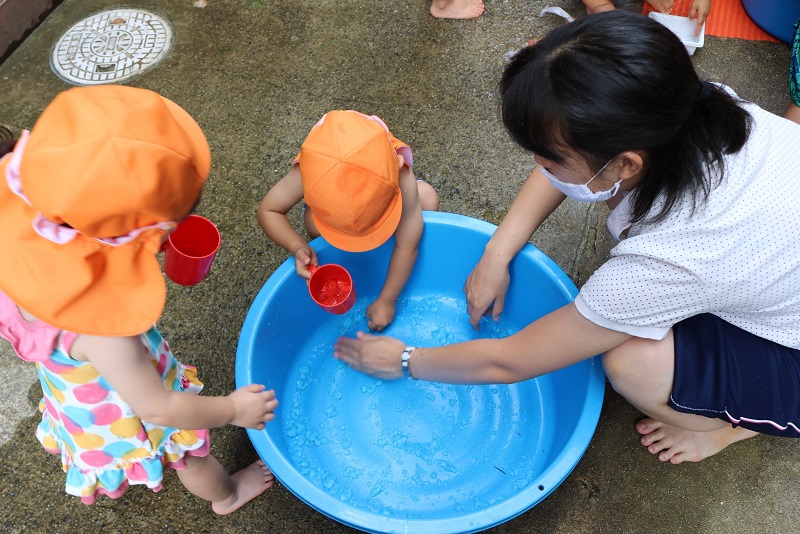 風の通る場所でタライを並べて水遊び&寒天の感触遊び