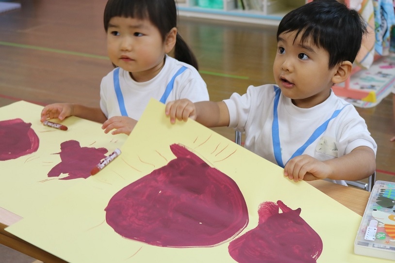 2歳児こぐま組とつぼみ組ではお芋の絵を描いています