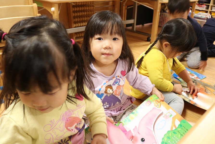 午睡前の隙間時間に本を読んで過ごす2歳児こぐま組