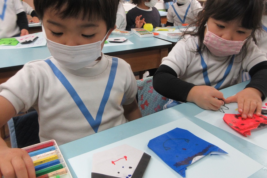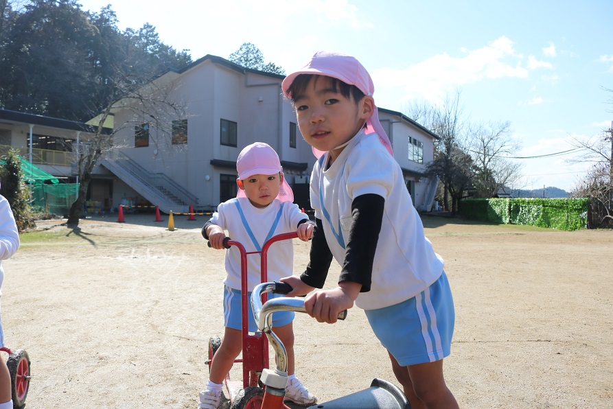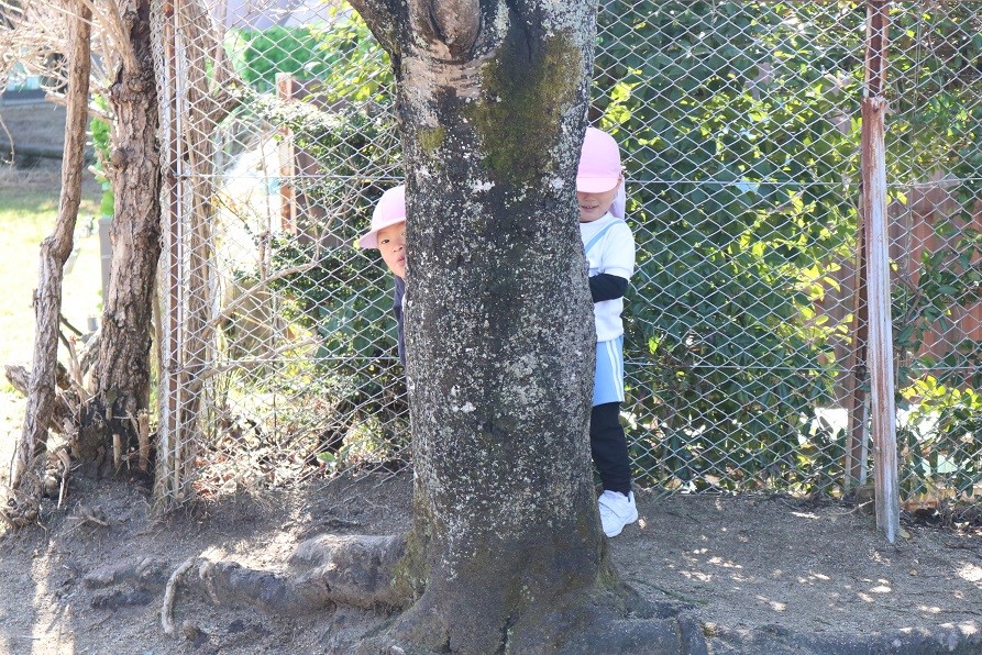 先生と一緒にかくれんぼをする2歳児つぼみ組です
