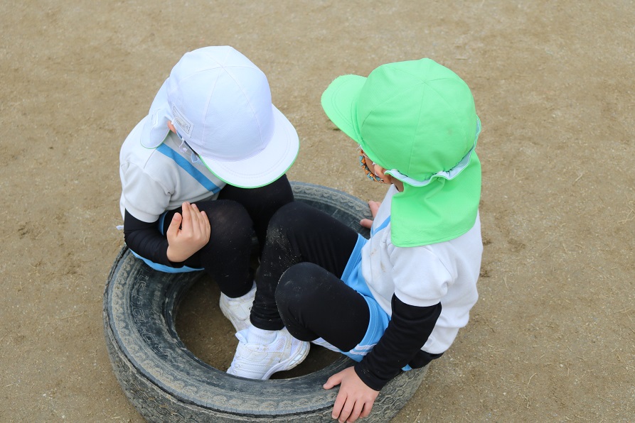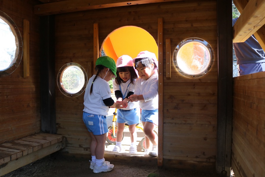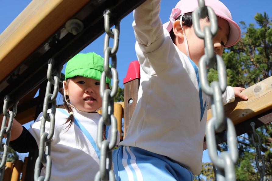 園庭の大型遊具で元気に遊ぶ年長組の女の子