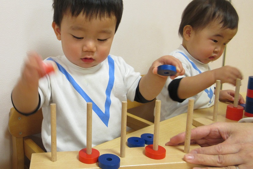 知育玩具のプラステンを頑張る0歳児ひよこ組