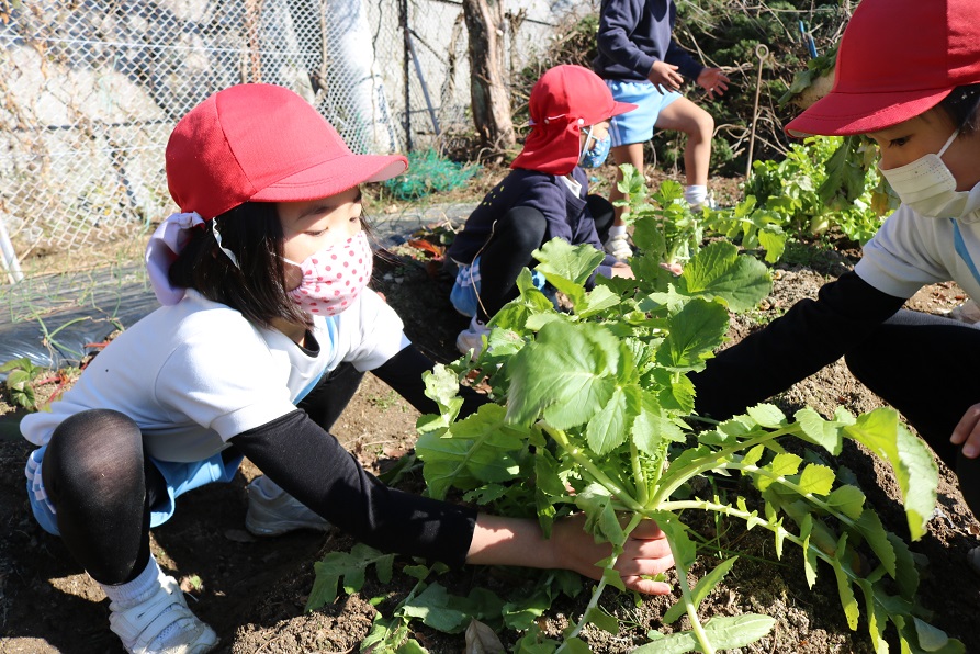 畑では年長すずらん組が大根収穫をしたりと