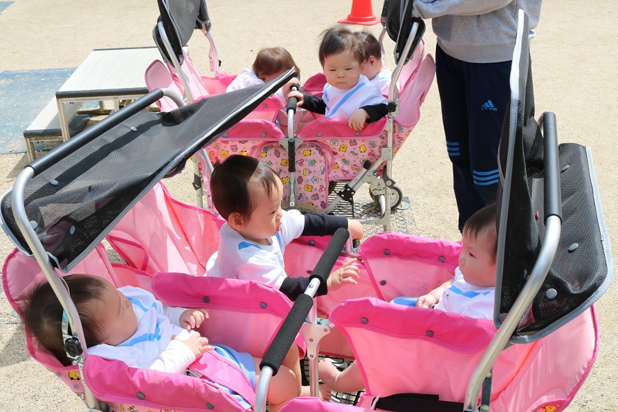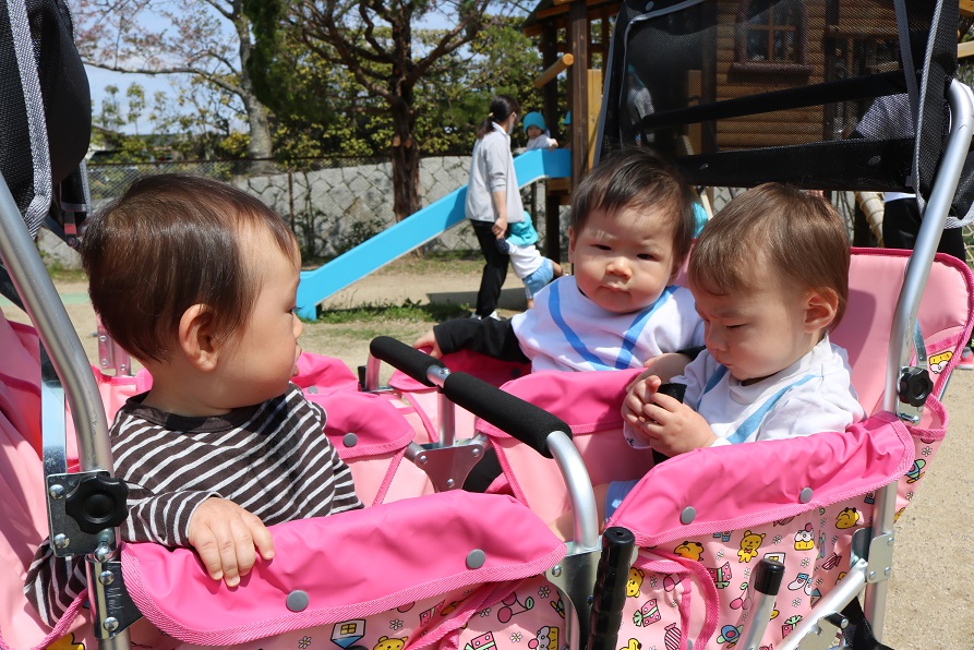 今日も気持ちいい晴天のなかバギーに乗って園庭にお散歩