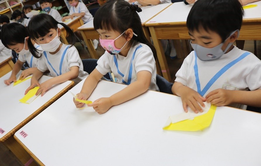 カレンダー制作のため折り紙でカタツムリを作る年少もも組