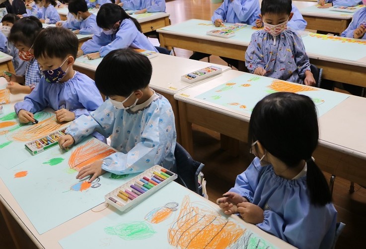 展示物の背景になる絵の作成に取り組むクラス