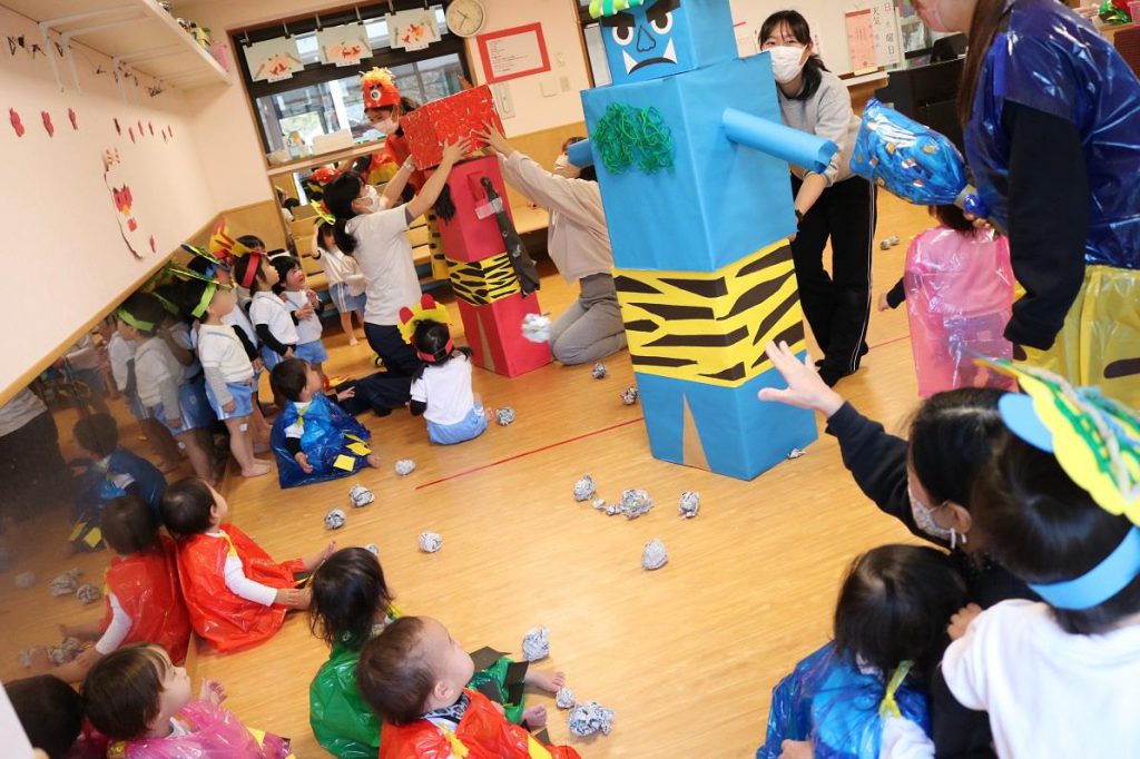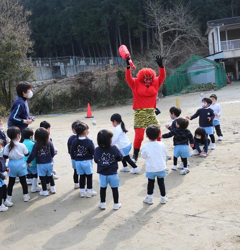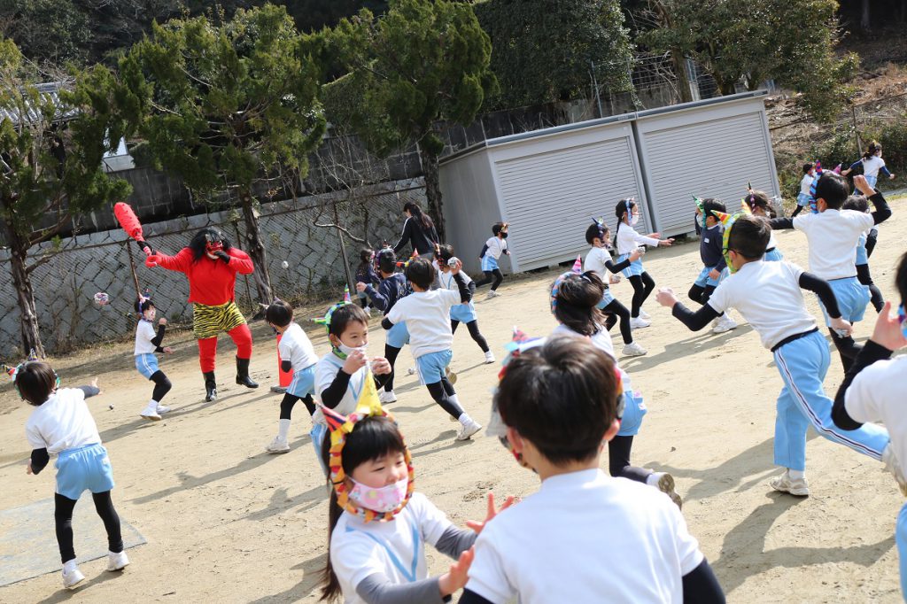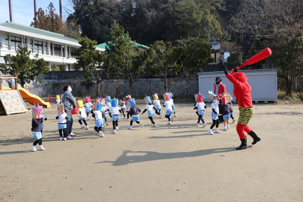 今年は学年ごとに分かれ園庭で鬼退治
