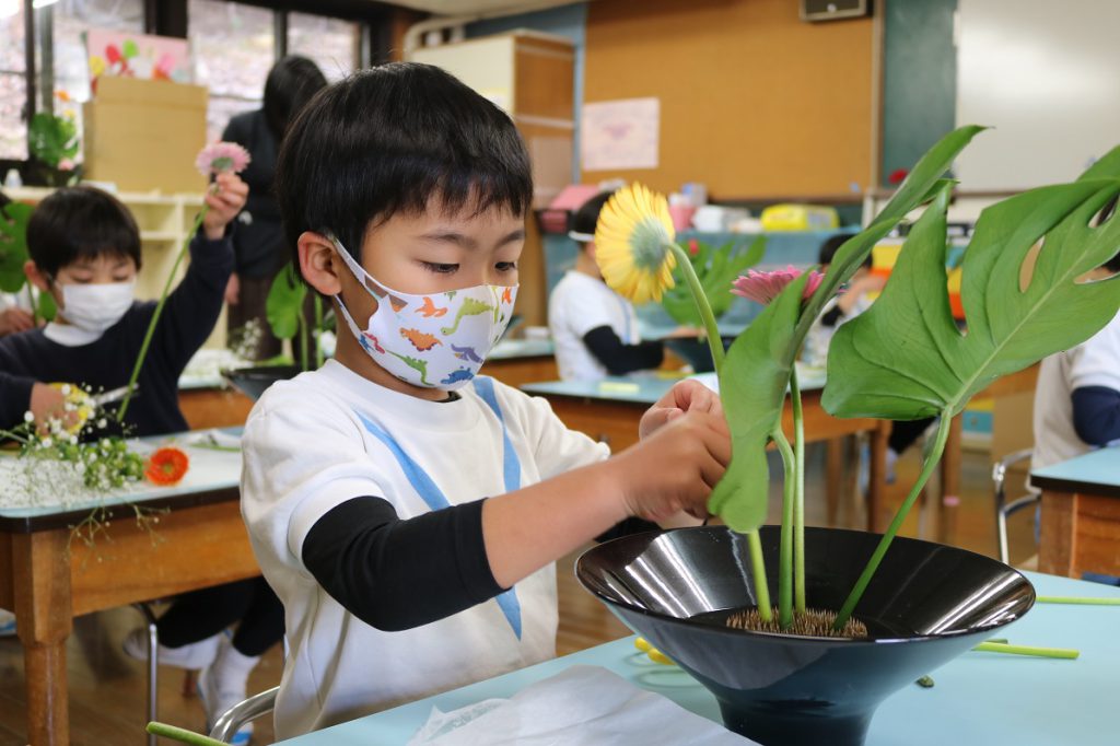 そして今日、年長すずらん組では華道レッスンがありました