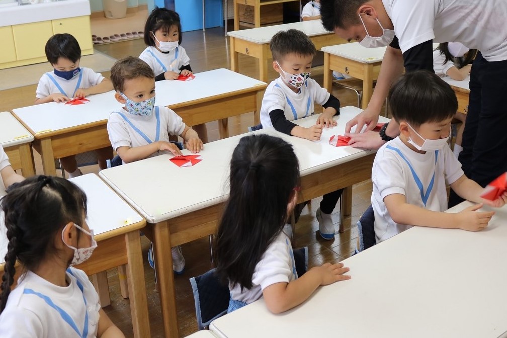 年中たんぽぽ組では5月のカレンダー制作のため折り紙でイチゴを作成中🍓