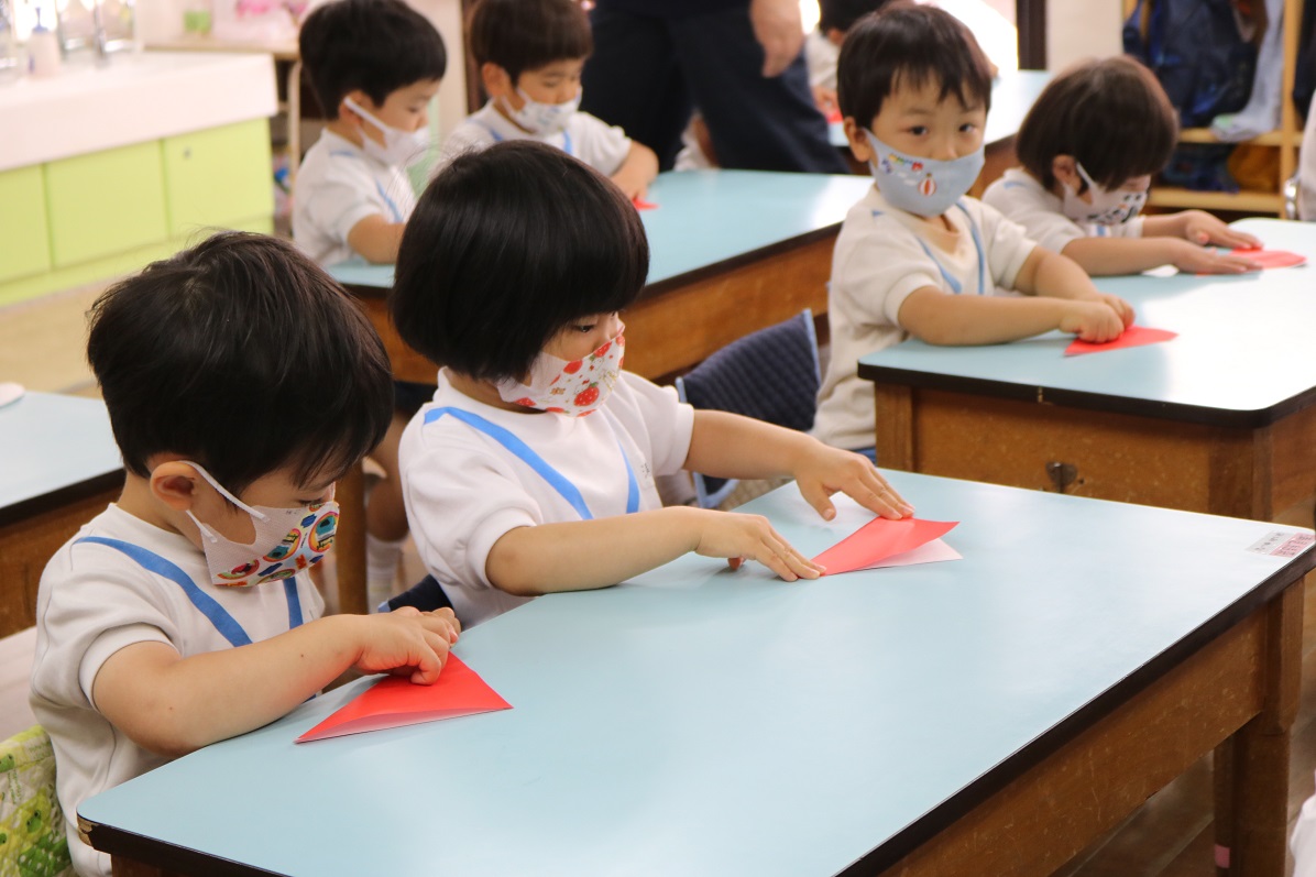 年少もも組では折り紙でイチゴを作っていました