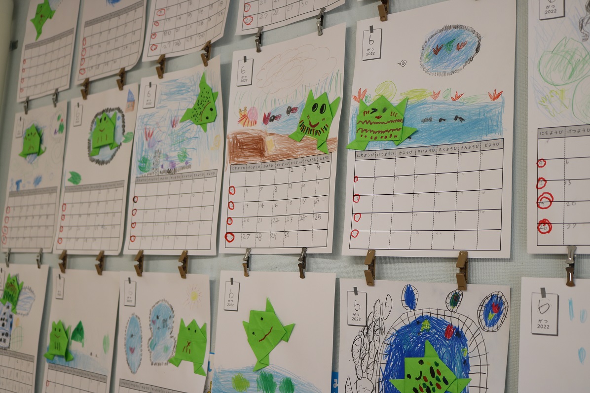 年中ではカタツムリ、年長はカエルをそれぞれ折り紙で作って