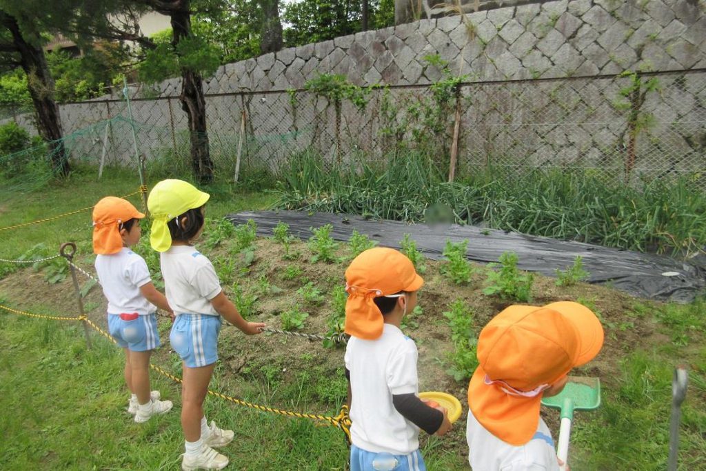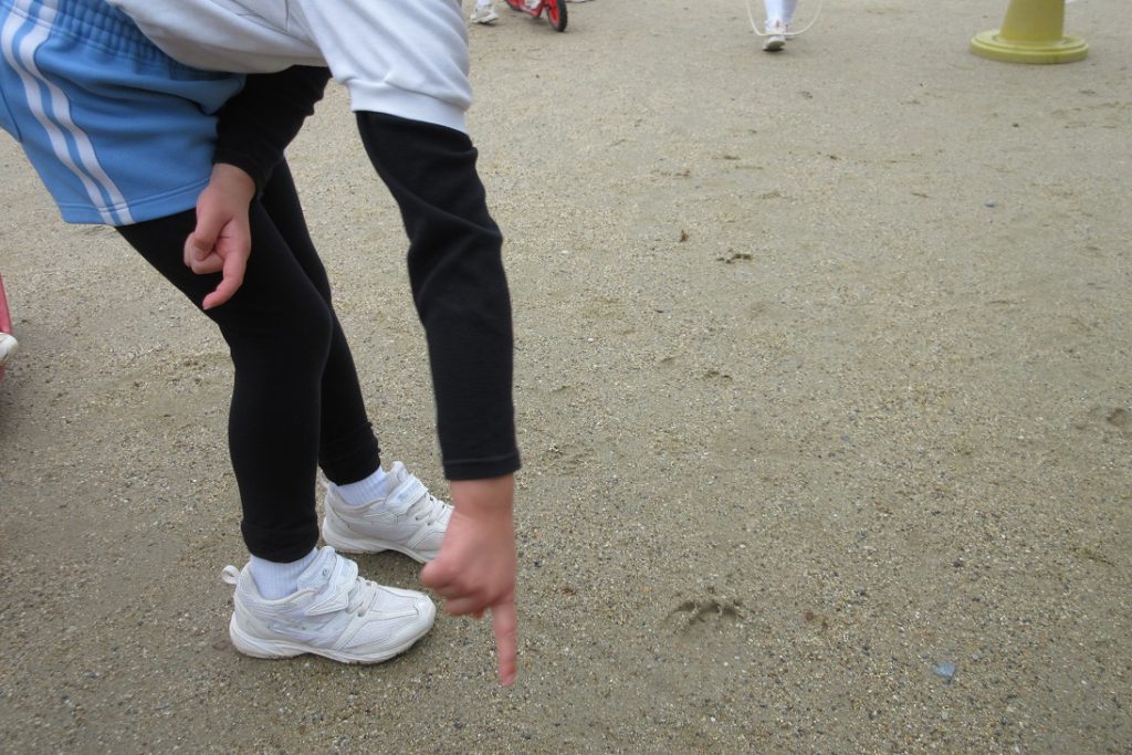 朝の園庭遊びで子どもたちが何やら発見した様子