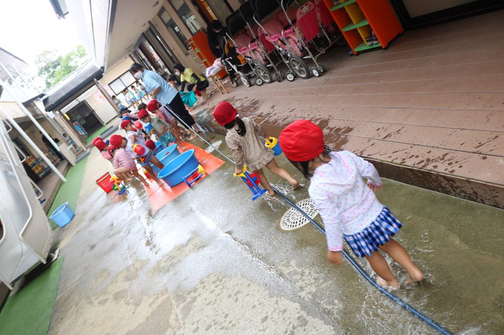 2歳児こぐま組のみんなが楽しく水遊び中です!