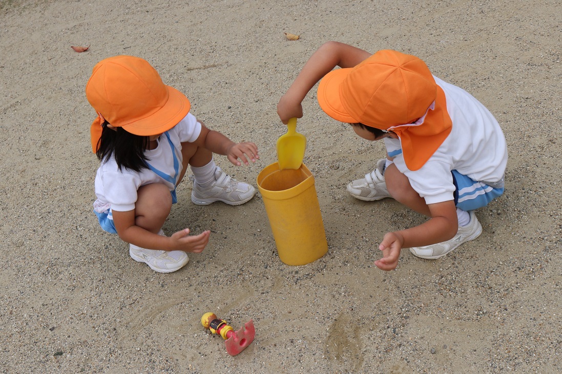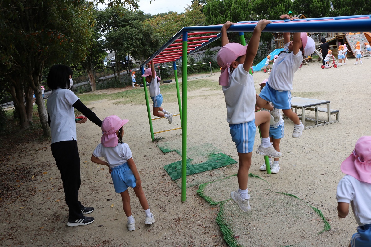 園庭では風が吹くたびに「さむっ!」「さむいなあ!」と子どもたちのこえ