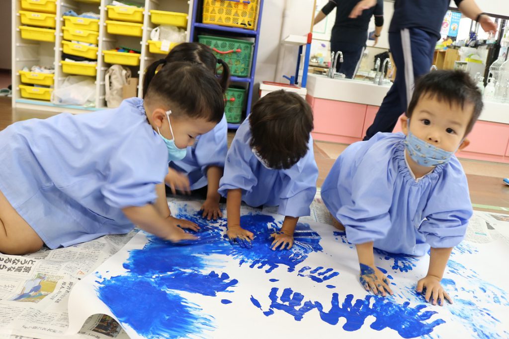 2歳児つぼみ組でも模造紙に青い絵の具をペタペタ