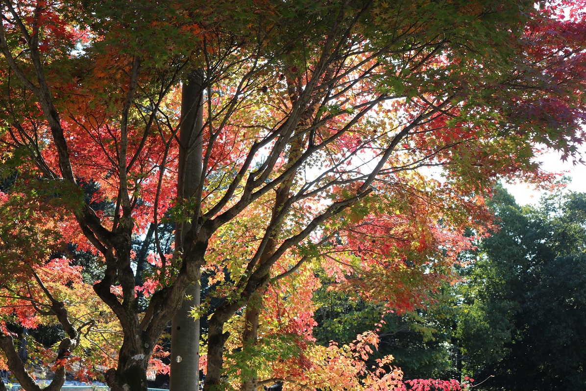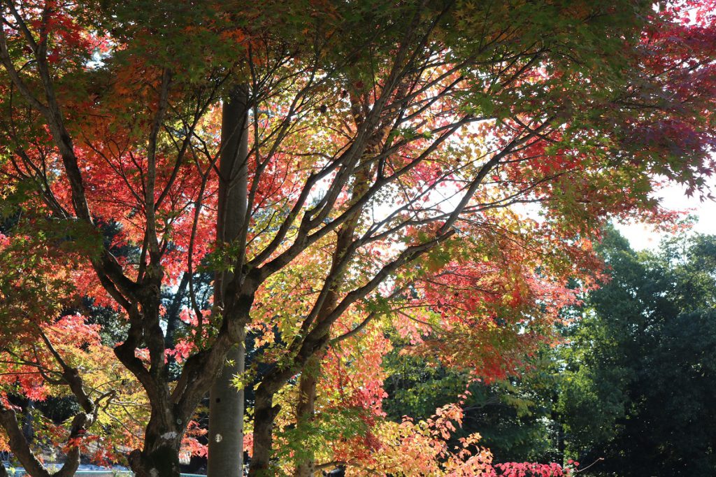 正門横のもみじとかえでの緑・黄・赤のグラデーションも