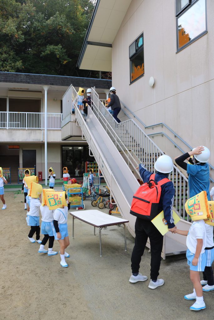 年長すずらん組と年少もも組が非常すべり台を使用しました